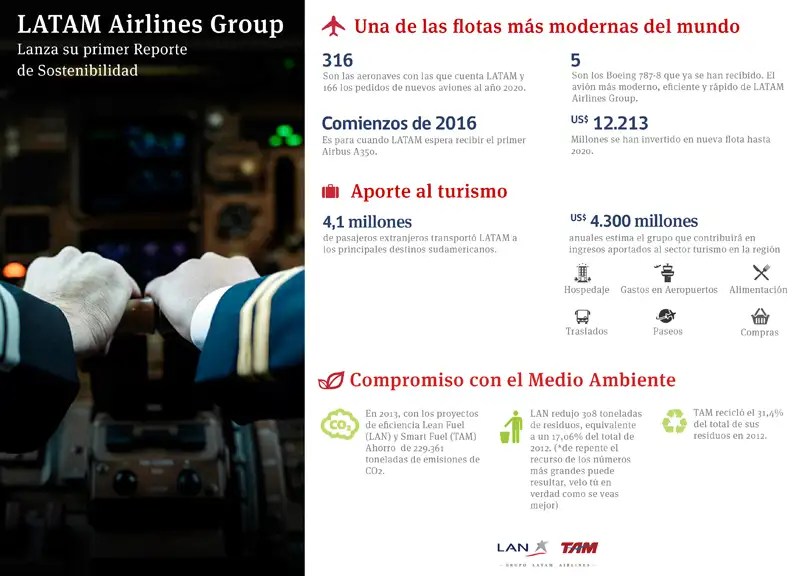 Como ejemplo de lo anterior, hoy las flotas de LAN y TAM tienen una edad promedio de siete años, lo que la coloca en una de las más modernas de la industria del transporte aéreo. Al tener una flota joven, lo que redunda en mayores eficiencias en torno al uso de combustible y menores emisiones de gases de efectos invernadero. Al mismo tiempo, menores costos amplían los beneficios los que son traspasados en distinta forma a los pasajeros y a la sociedad. La compañía tiene compromisos en inversiones por US$ 12.213 millones hasta 2020 en 166 nuevos aviones entre los que están el Airbus A320neo, A350 y Boeing 787.
